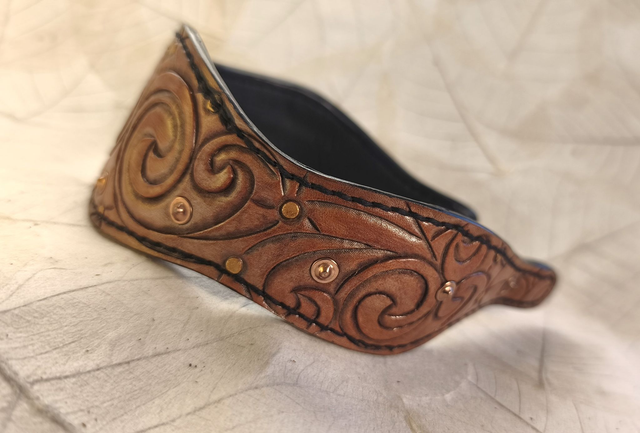 Ce bandeau en cuir repoussé est orné de motifs préceltiques en volutes, symbolisant les éléments de la nature et les forces primordiales. Réalisé artisanalement, il est doublé de cuir de vachette noir et renforcé par une armature intérieure métallique assurant maintien et confort.