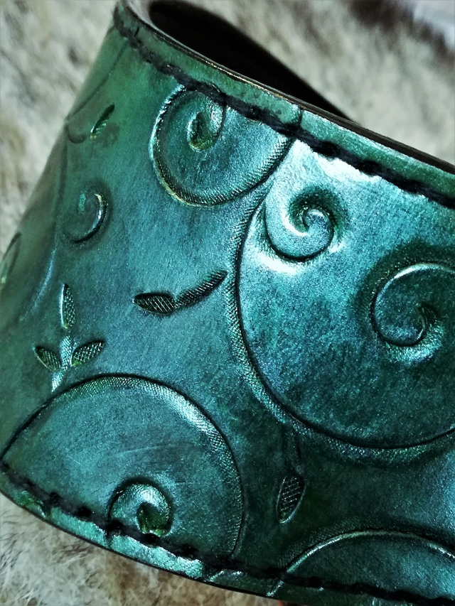Le cuir est repoussé de rinceaux décoratifs puis teinté dans un vert bleuté nacré, aux reflets subtils inspirés de la nature et des univers médiévaux. Un renfort métallique interne assure un excellent maintien tout en conservant le confort au porté.