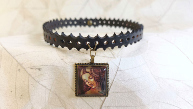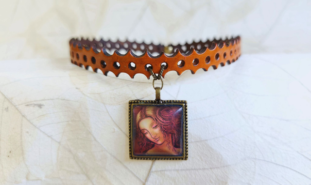 Tour de cou en cuir épais, découpé et ajouré, et orné d’un médaillon carré mettant en valeur la reproduction en cabochon de notre tableau en cuir repoussé LEDA, inspiré de Léonard de Vinci. Le contraste entre la force du cuir et la finesse du motif crée un bijou de caractère.