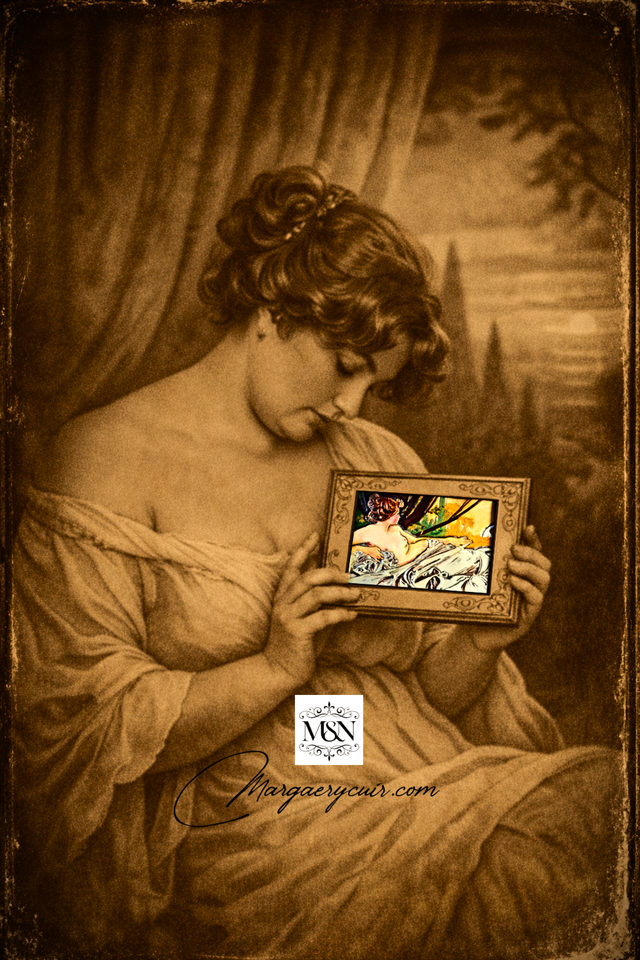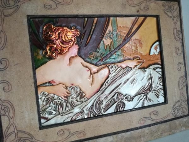 Tableau en cuir repoussé encadré d'après un nu délicat intitulé l'aube de Mucha. Art nouveau. Original.Dimensions totales 23X28cm.