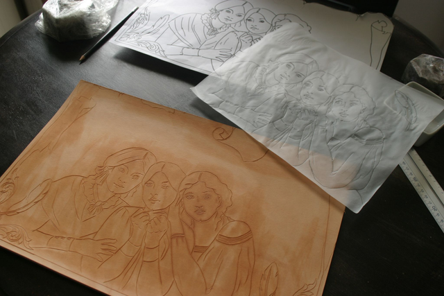 Ce tableau original en cuir repoussé illustre les trois femmes et les liens profonds d’affection et de création qui les unissent. Réalisé en cuir de vachette tanné végétal d’environ 2,8 mm d’épaisseur, il intègre, dans les angles inférieurs, des feuilles d’acanthe s’ouvrant sur une plume d’écritoire, symbole de leur vocation littéraire.