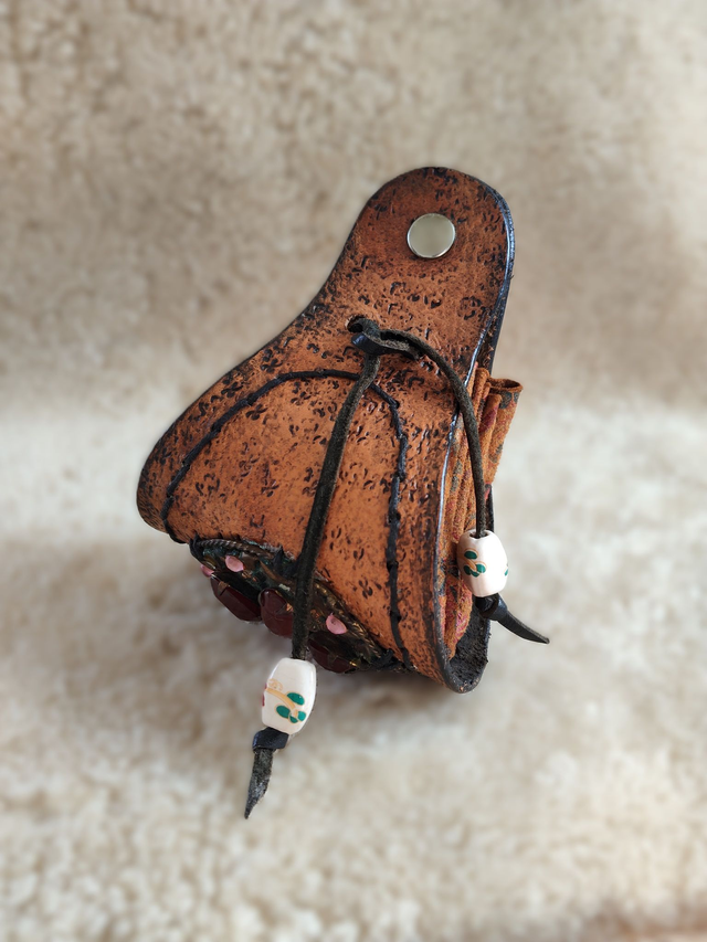 Petite bourse aumonière tout cuir avec pour base un cabochon de métal vieilli spectaculaire en pierres serties .Double fermeture pression et lien de cuir. H10cm sur Base 8cm. Marron.