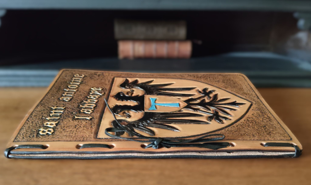 Ce carnet en cuir repoussé, réalisé en cuir de vachette tanné végétal rigide (2 mm), est orné du blason du village isérois de Saint-Antoine-l’Abbaye, classé parmi les Plus Beaux Villages de France et Village préféré des Français 2025.