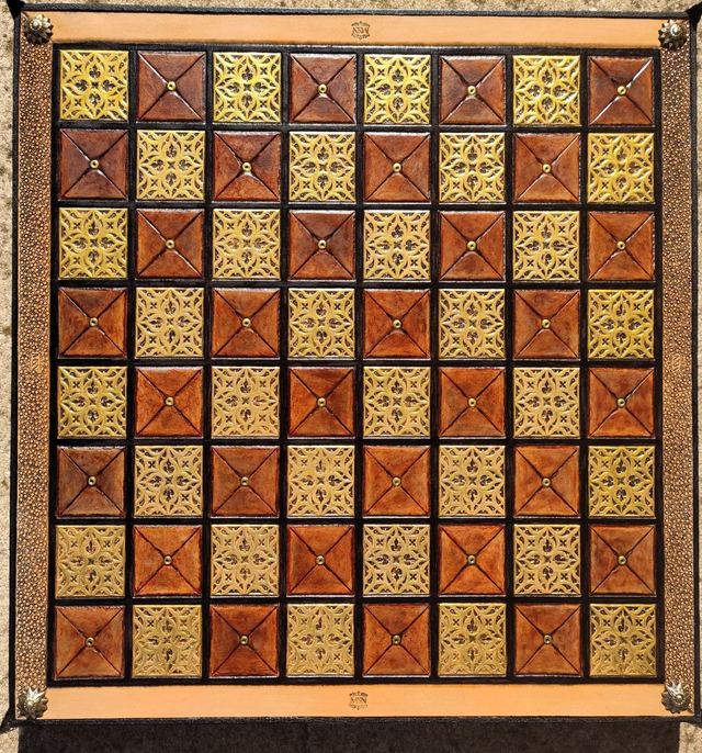 Jeu d'échecs médiéval XVème siècle en cuir repoussé doré