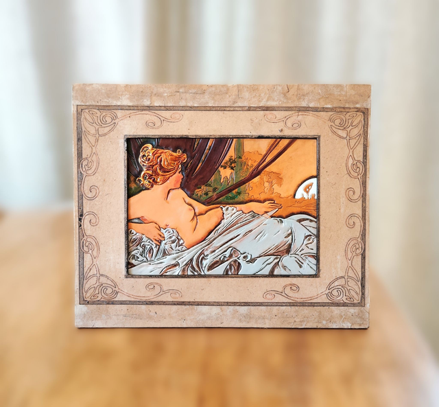 Tableau en cuir repoussé encadré d'après un nu délicat intitulé l'aube de Mucha. Art nouveau. Original.Dimensions totales 23X28cm.