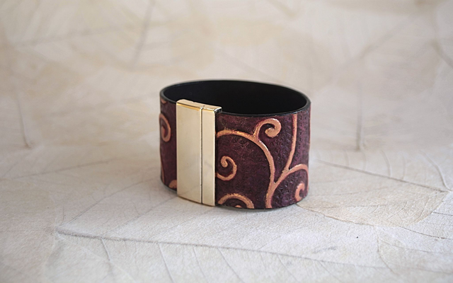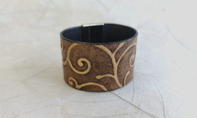 Manchette en cuir naturel repoussé, sculptée à la main, d’une largeur de 4 cm.